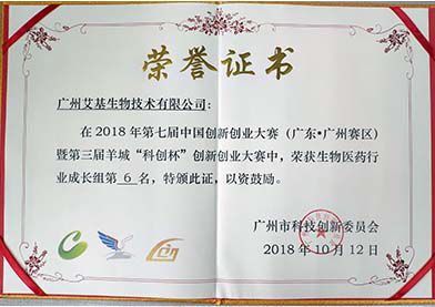第七屆中國創新創業大賽(廣東·廣州賽區)暨第三屆羊城“科創杯”創新創業大賽(以下簡稱創新創業大賽)頒獎典禮在廣州洲際酒店舉行,最終評出76個獎項。經過層層篩選,最終廣州艾基生物在本次大賽中獲得生物醫藥行業成長組第6名的成績!